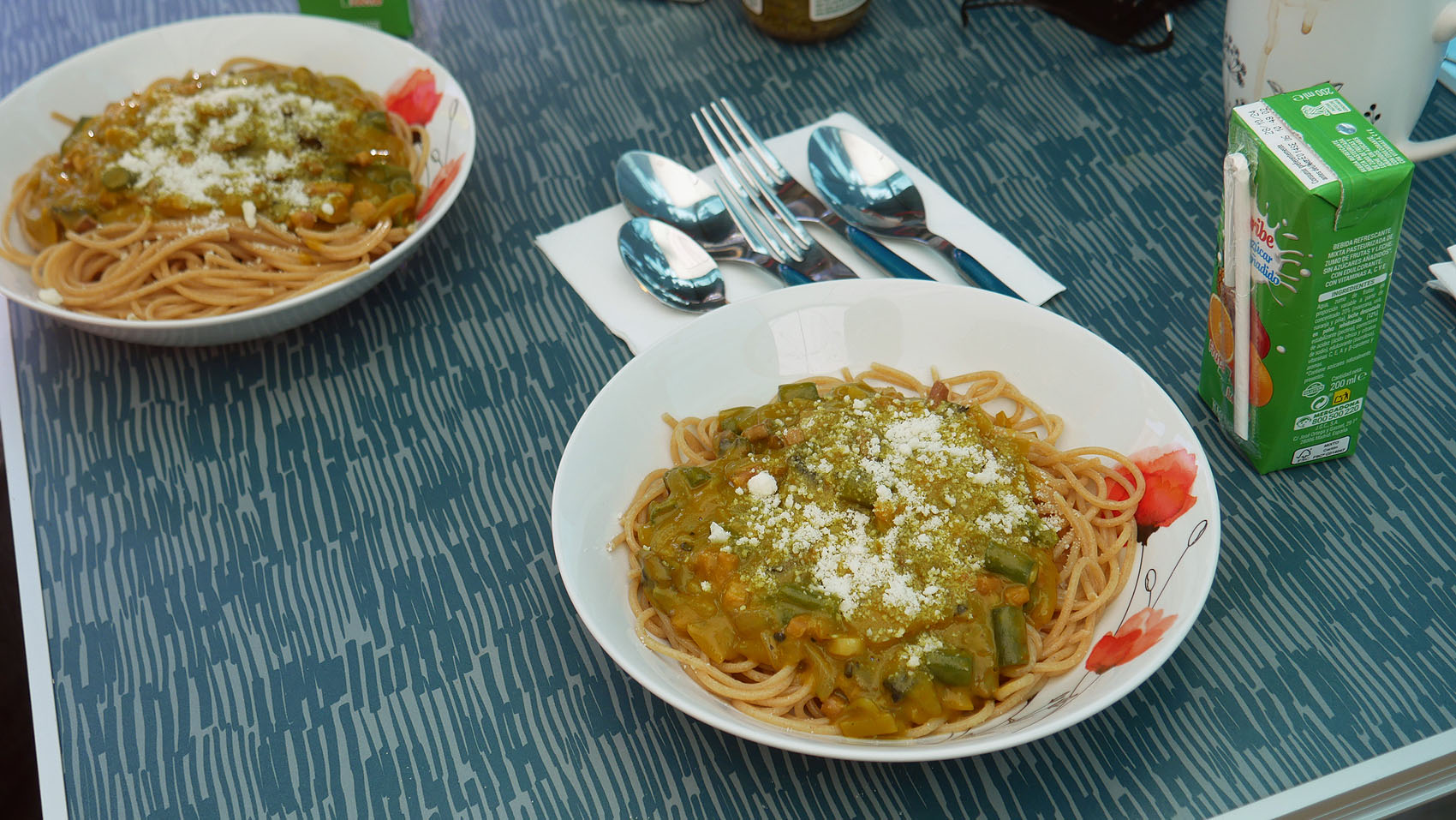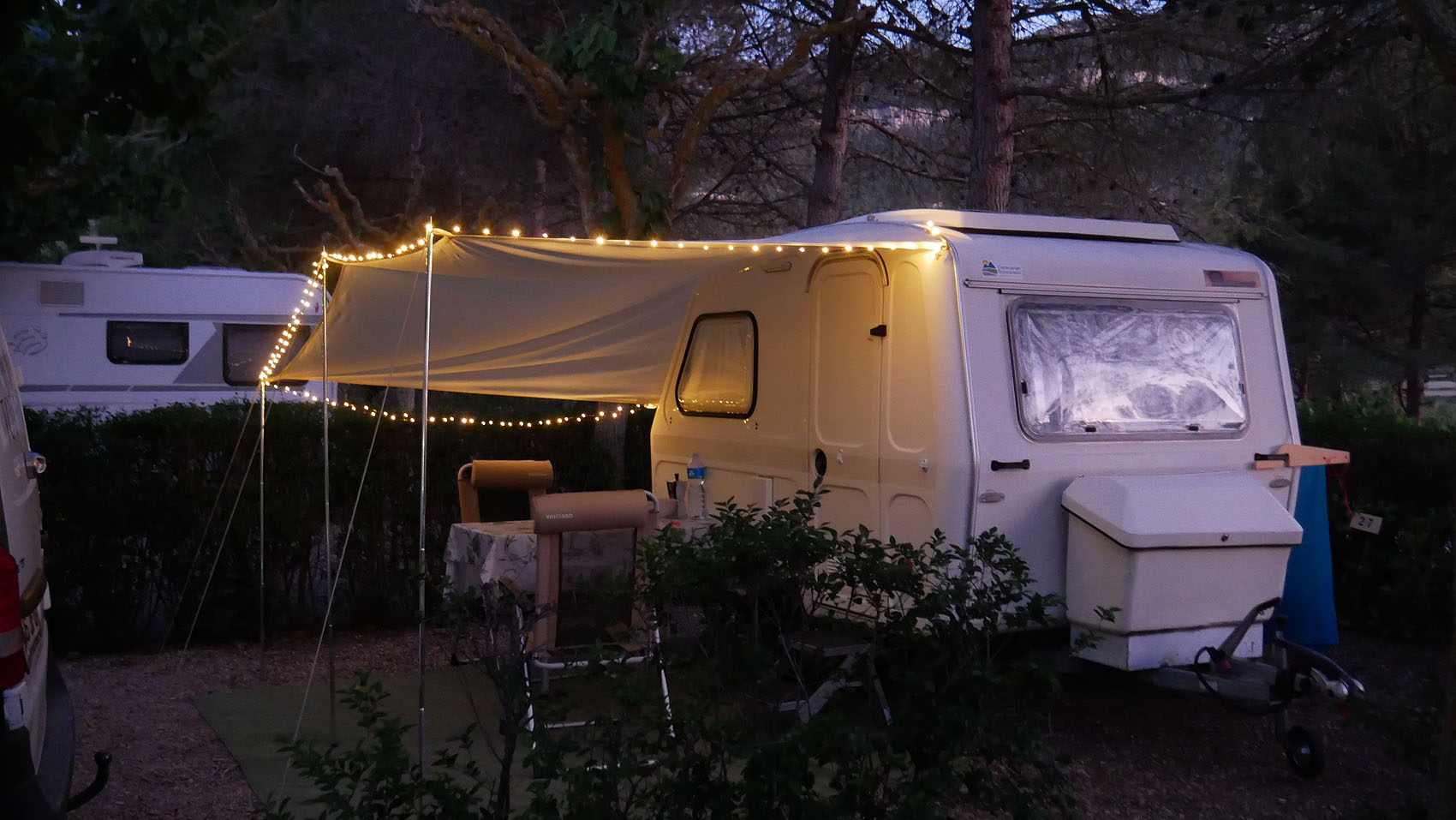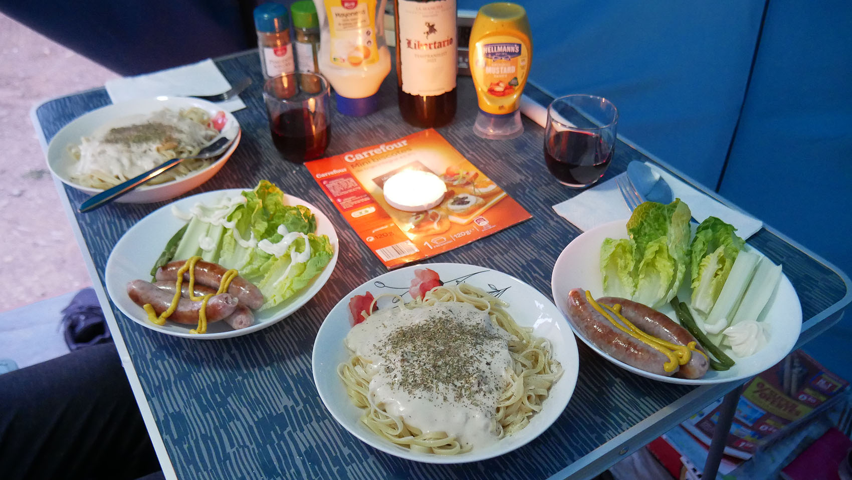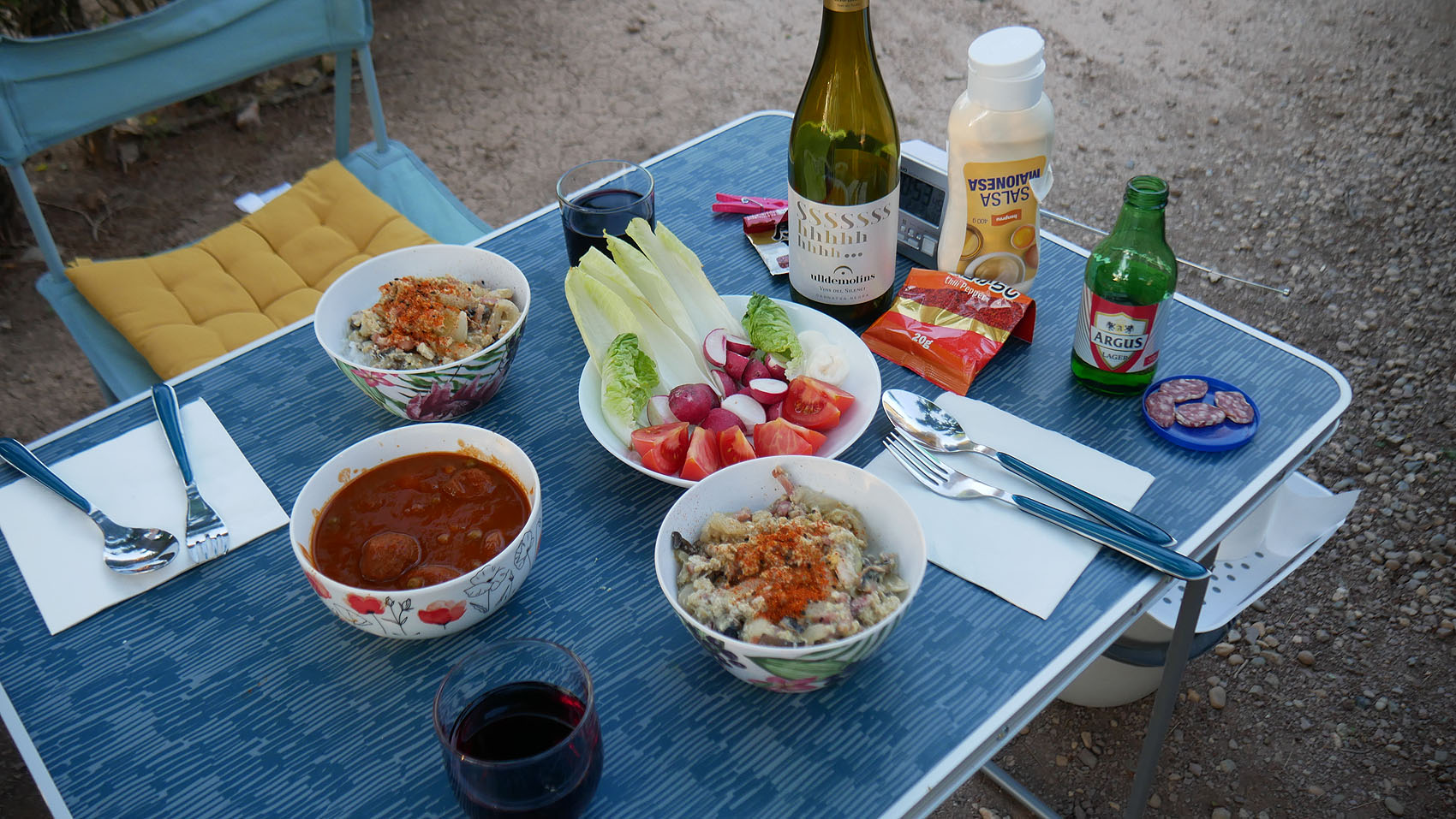 ランタン照らして、PKのベンチとテーブルで、夕ご飯。