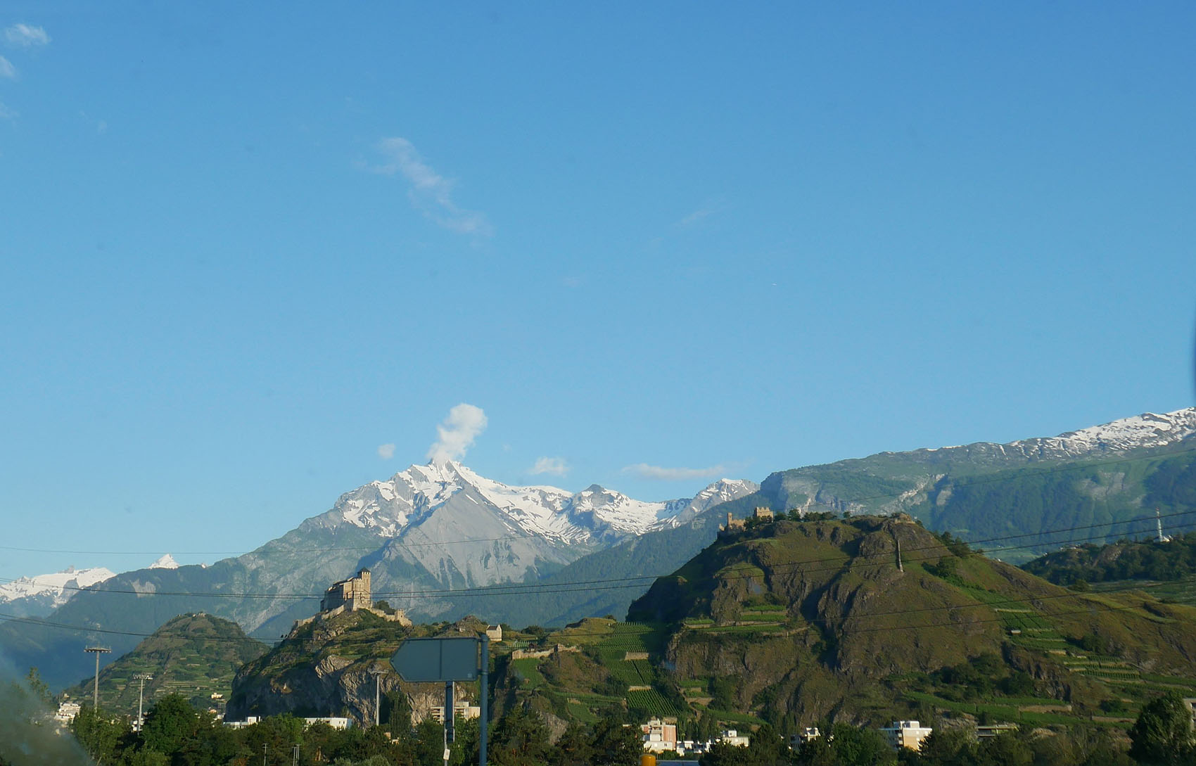 Thunを出るとき、ベルナーオーバーラント三山が、かなり上の方まで見えた。