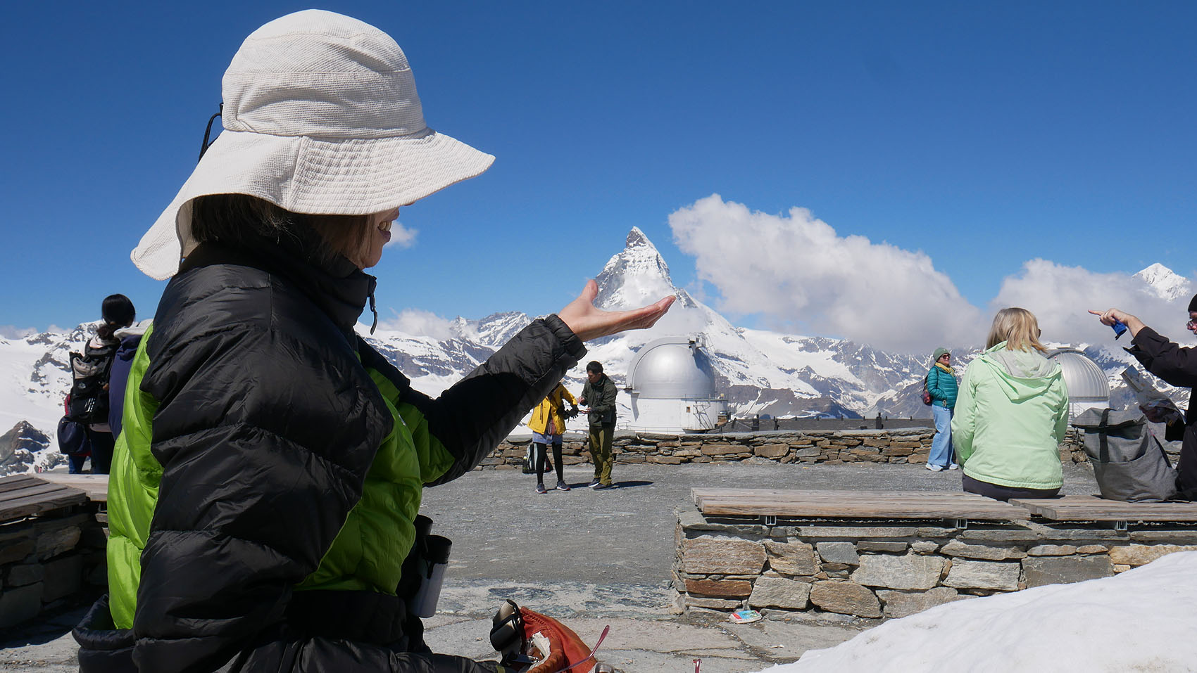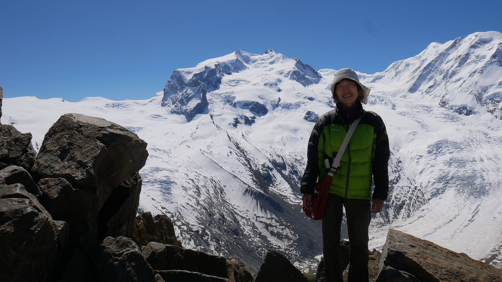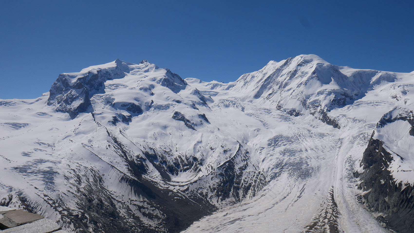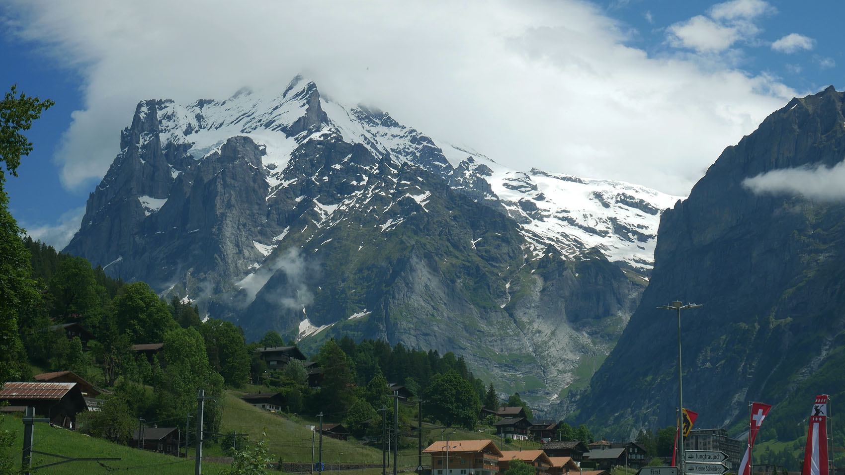 アイガー(Eiger)、メイヒ(Monch)、ユングフラウ(Jungfrau)と、ベルナーオーバーラント三山の中腹が見える。