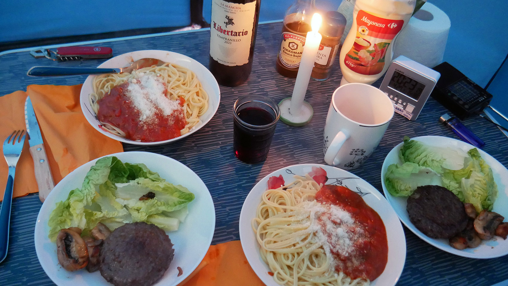 22時20分すぎて、キャンプ場のおばちゃんが、管理室?のドアを開けて、なにやらしている気配。