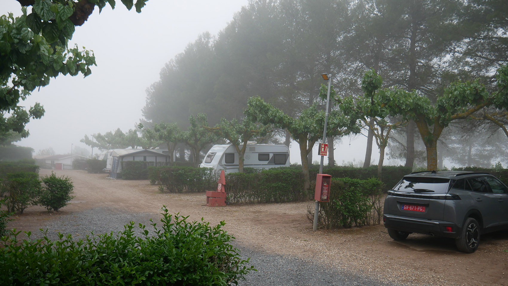 キャンプ場にも霧がただよう。
