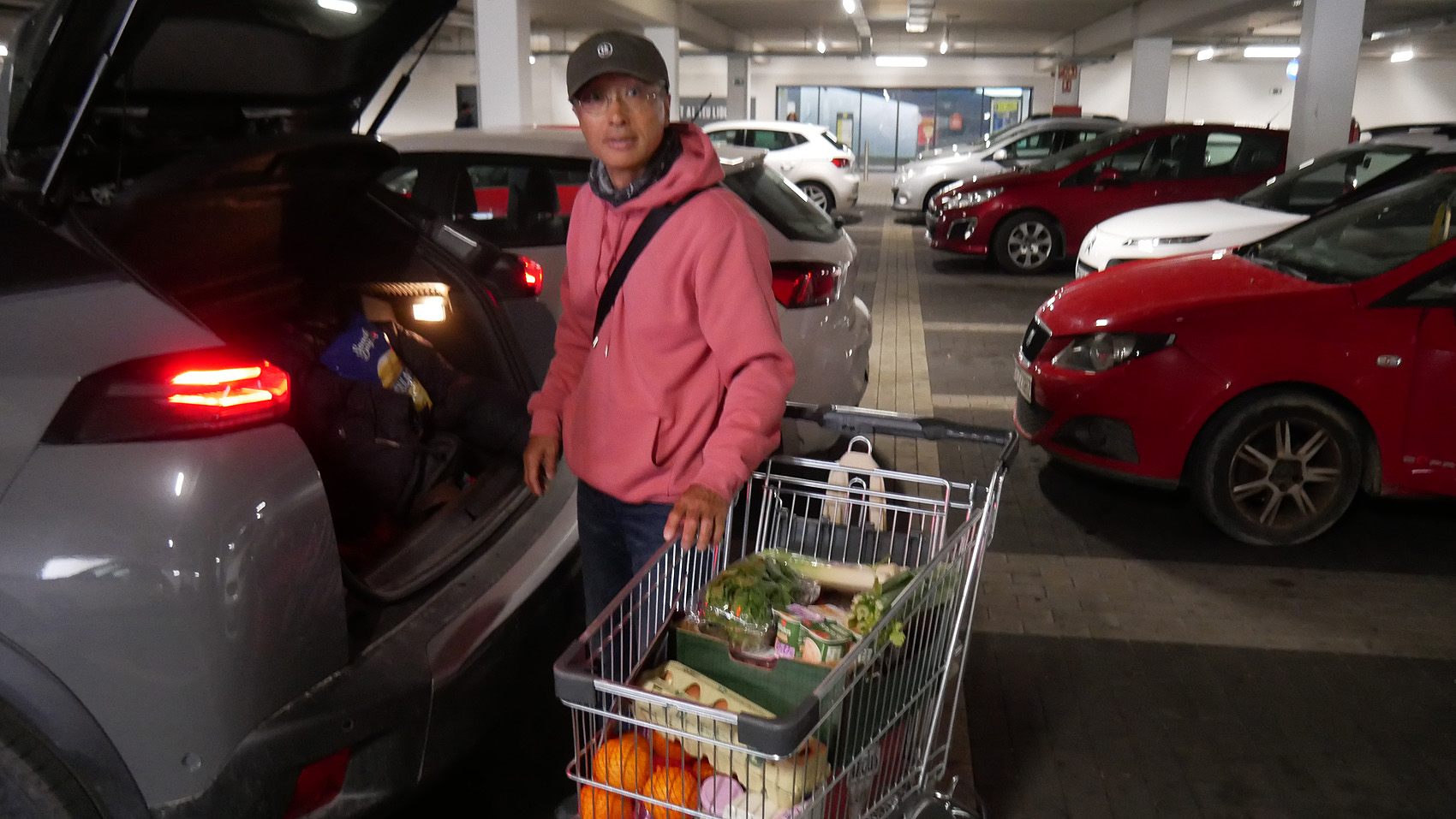 混んでて外の駐車場に停められないので、地下駐車場に停めたら、入口にいつもいる物乞いさんが座っている。