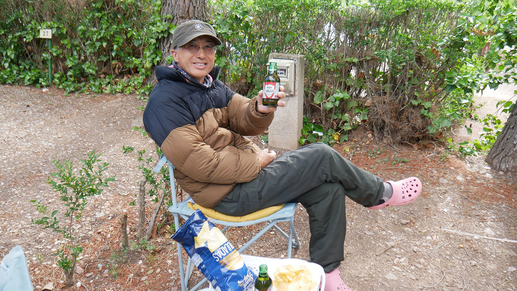 17時頃、晴れたので、外に椅子を出して、ポテチつまみに、ARGUSビールで乾杯