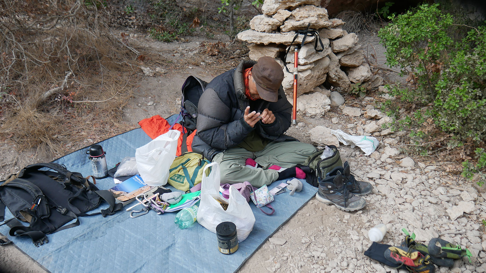 ▼登る前に、指の手入れをするダンナ
