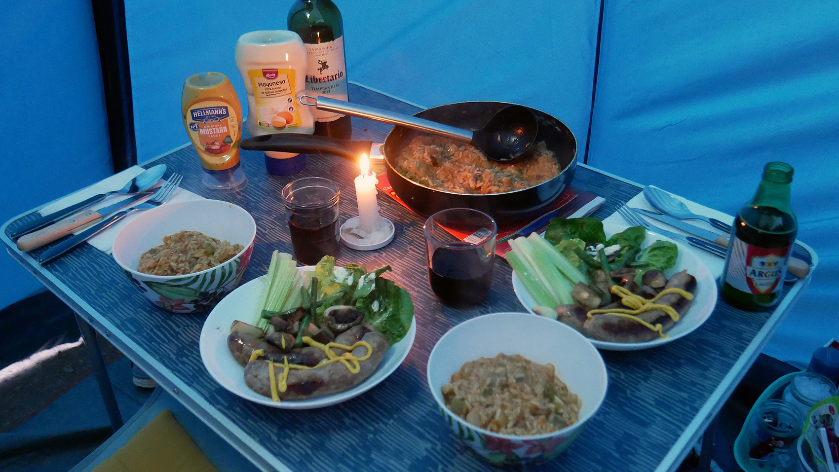 いつもの段取りで、交代でシャワーを浴びて、乾燥ソーセージつまみに。ビール。