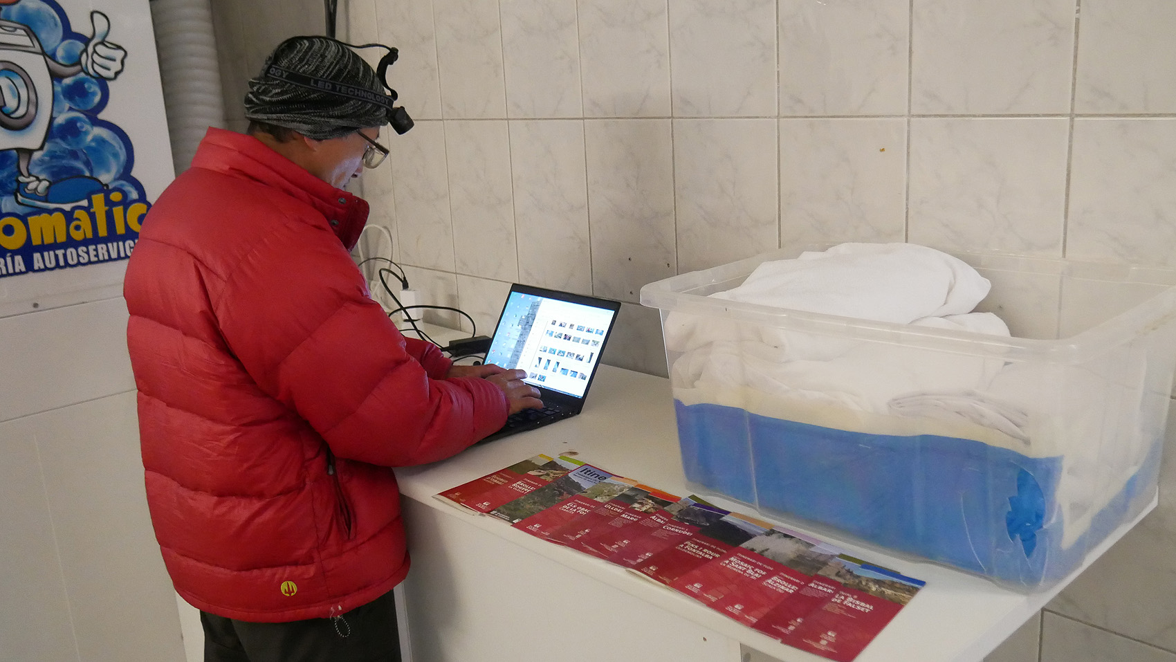 ▼洗い場の洗濯機の横で、PC作業するダンナ。ハイキングのパンフレットがいっぱい置いてある