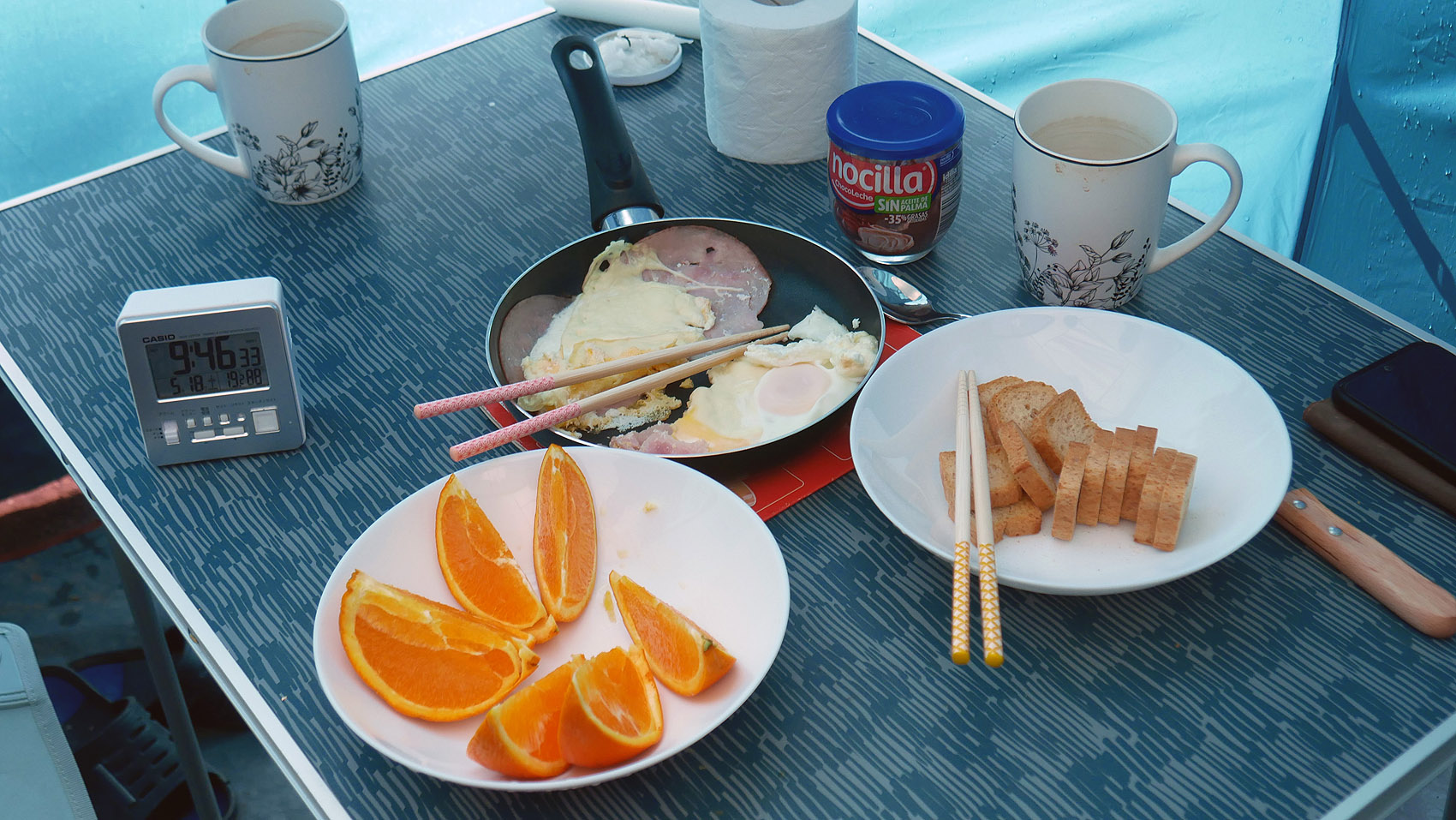 晴れているが、テントの手前に、でっかい水たまりができている。