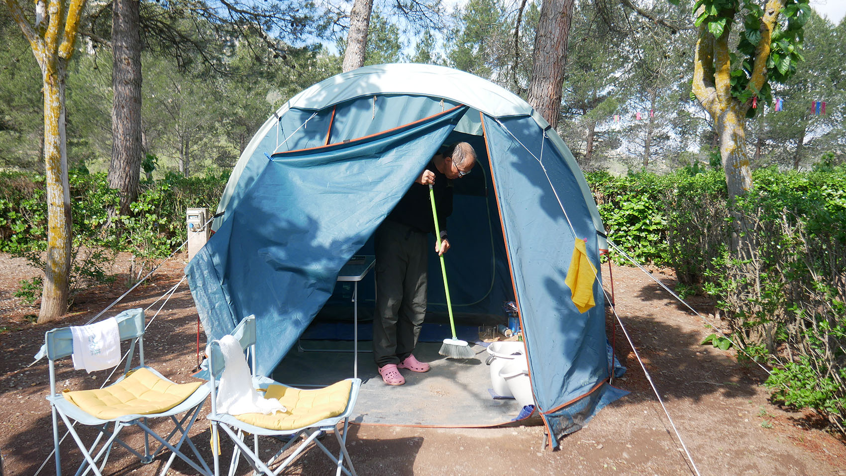 一つ空いて隣の立派なテントを張った男性が、また朝から電話している。