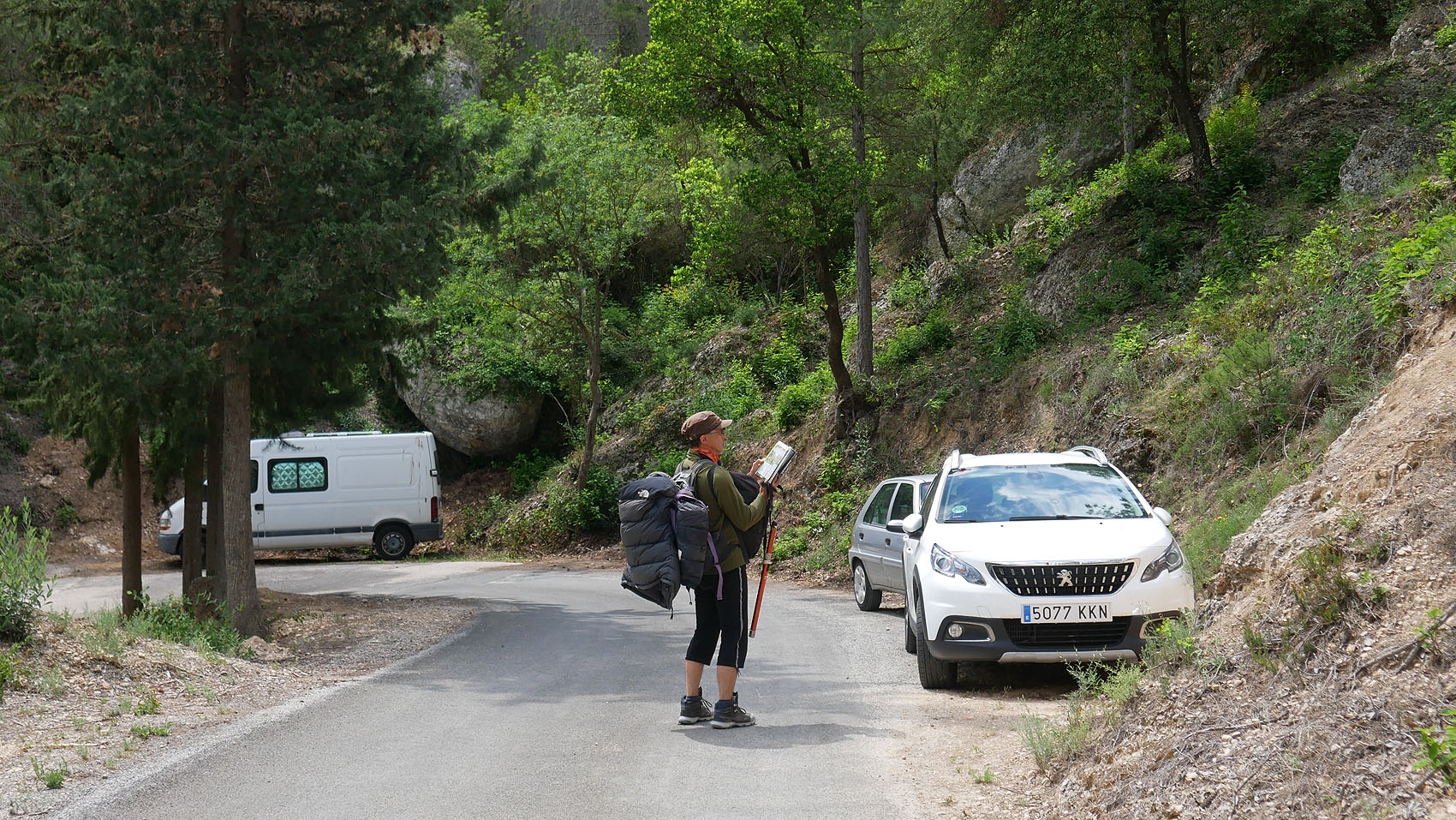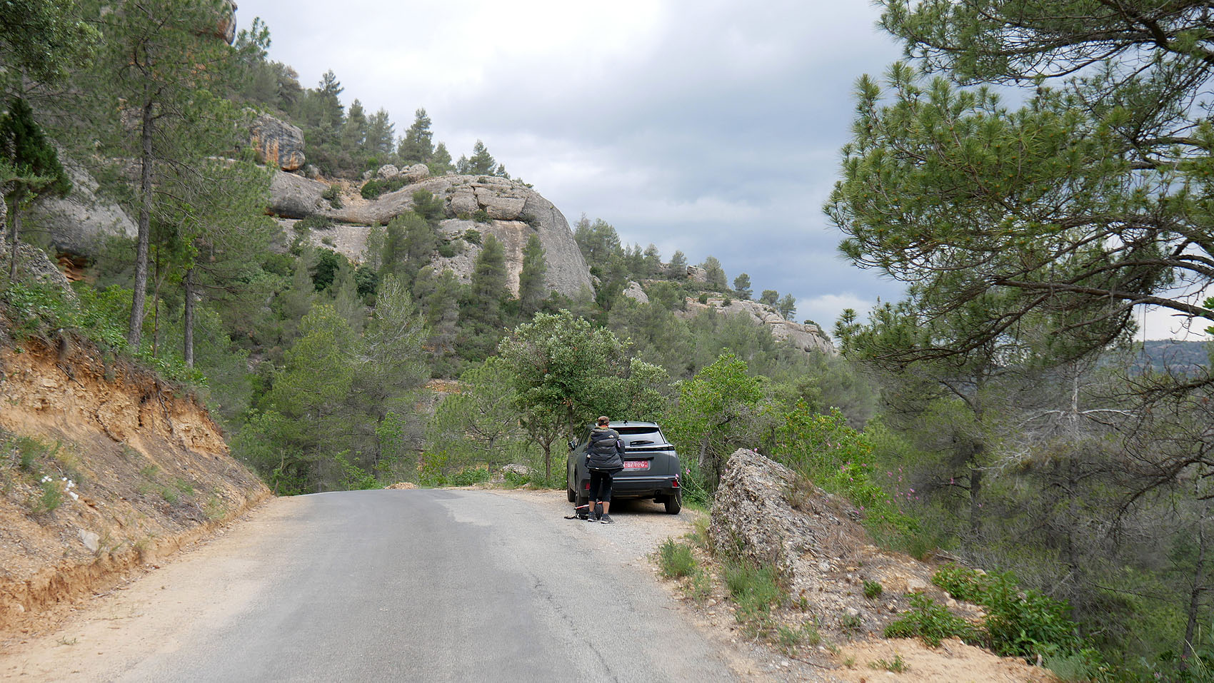 馴染みの Bloc del Porc エリアの、少し手前の路肩に車を停めたいが、始めての場所で分からないので、Bloc del Porc エリアの駐車ポイントまで行ってから、Uターンして探す。