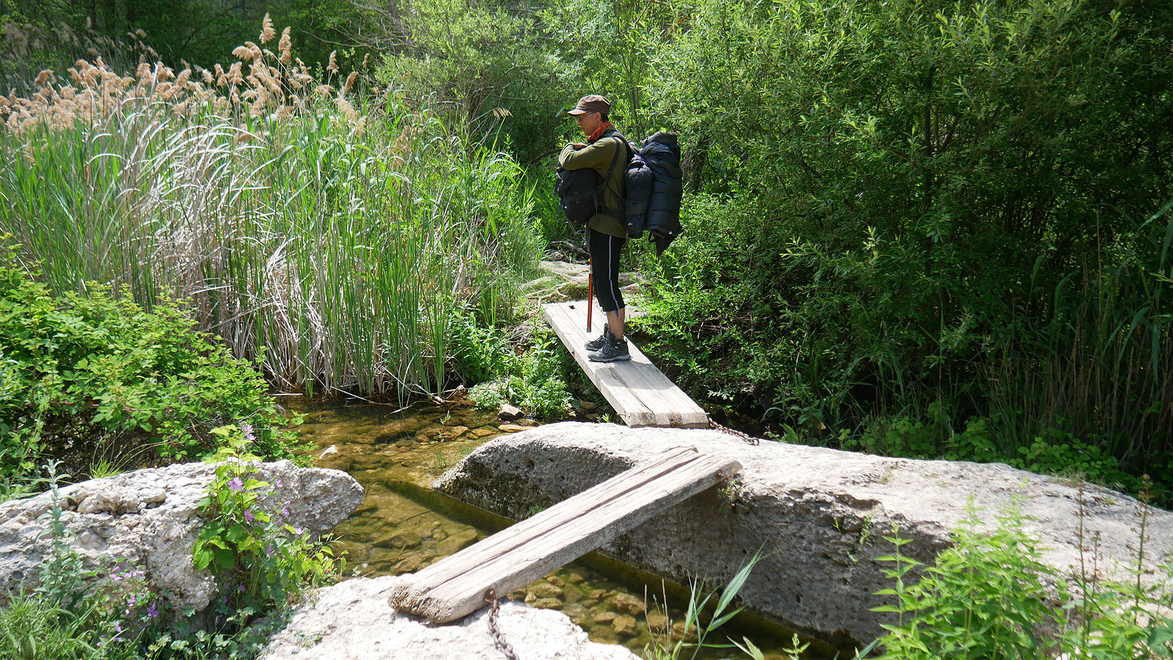 ▼駐車場の脇を流れる小川を渡って、岩場へ