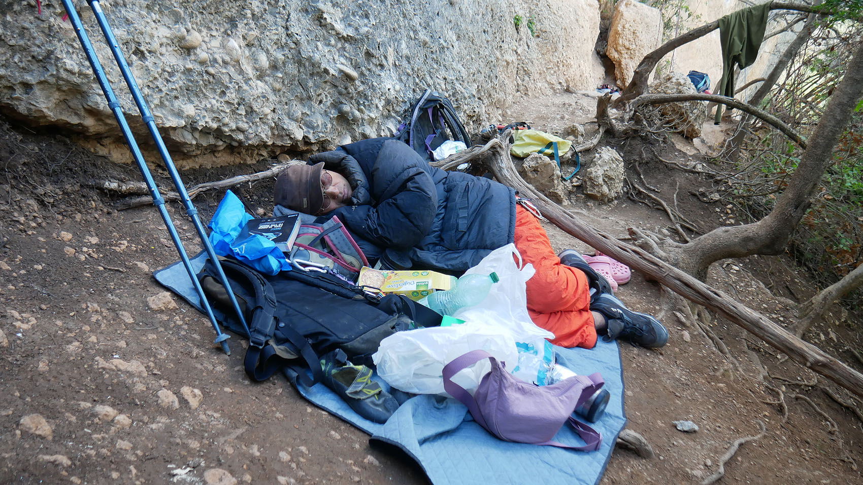 明け方寝汗をかいて寒くなり、久しぶりにシュラフを袋にした。