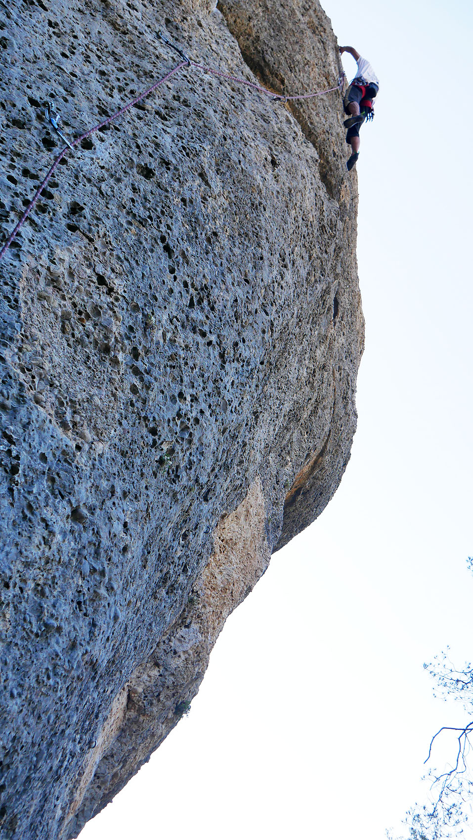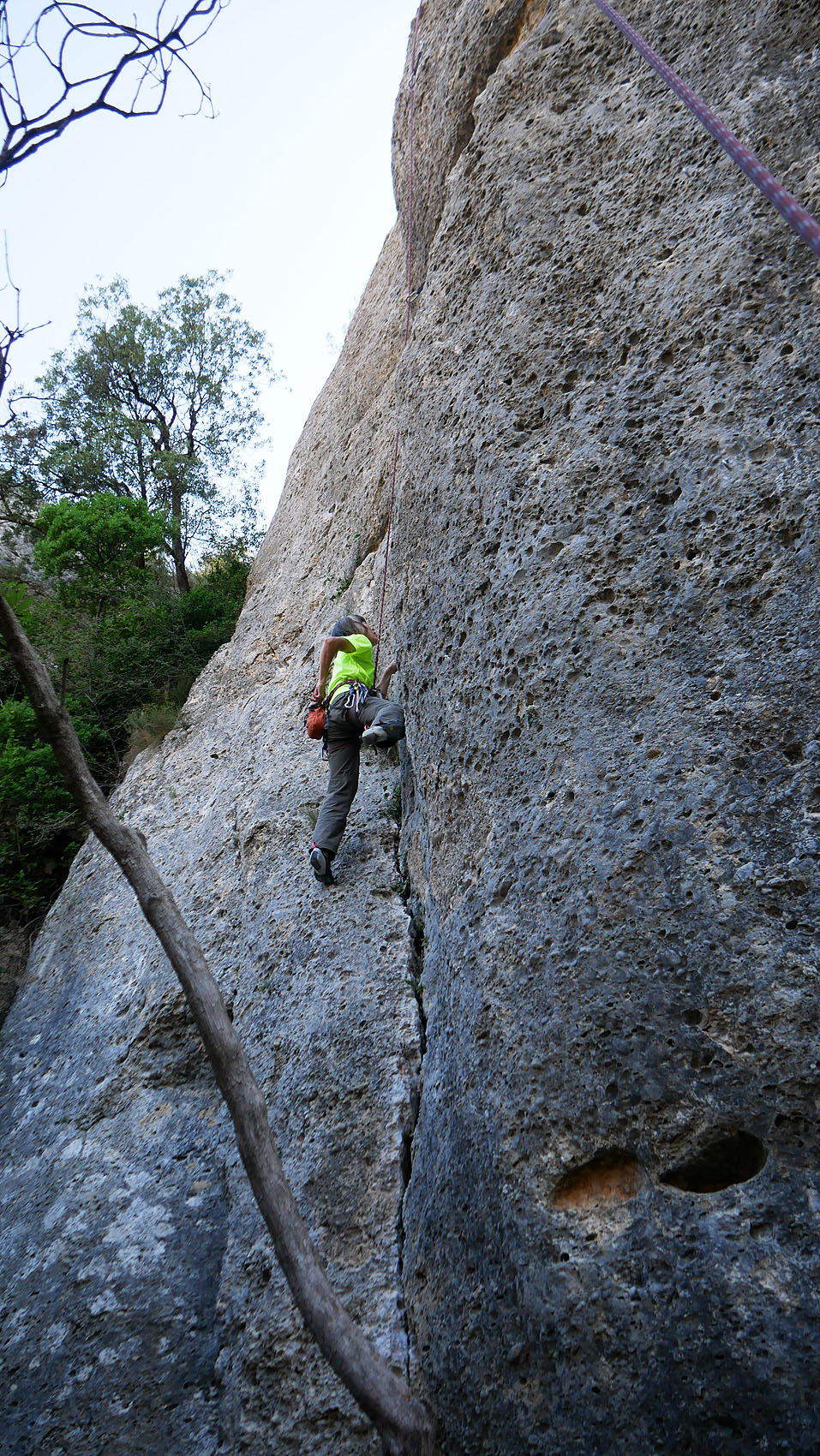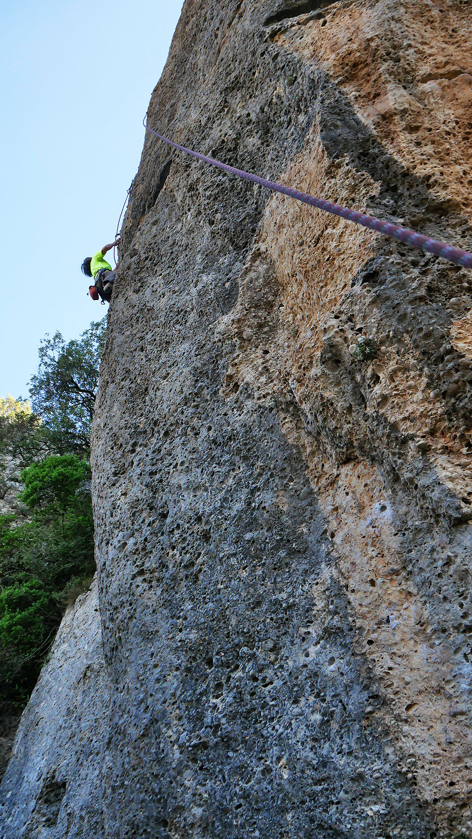 Ca la Marta エリアの右側のルートを登っているクライマーがいる。