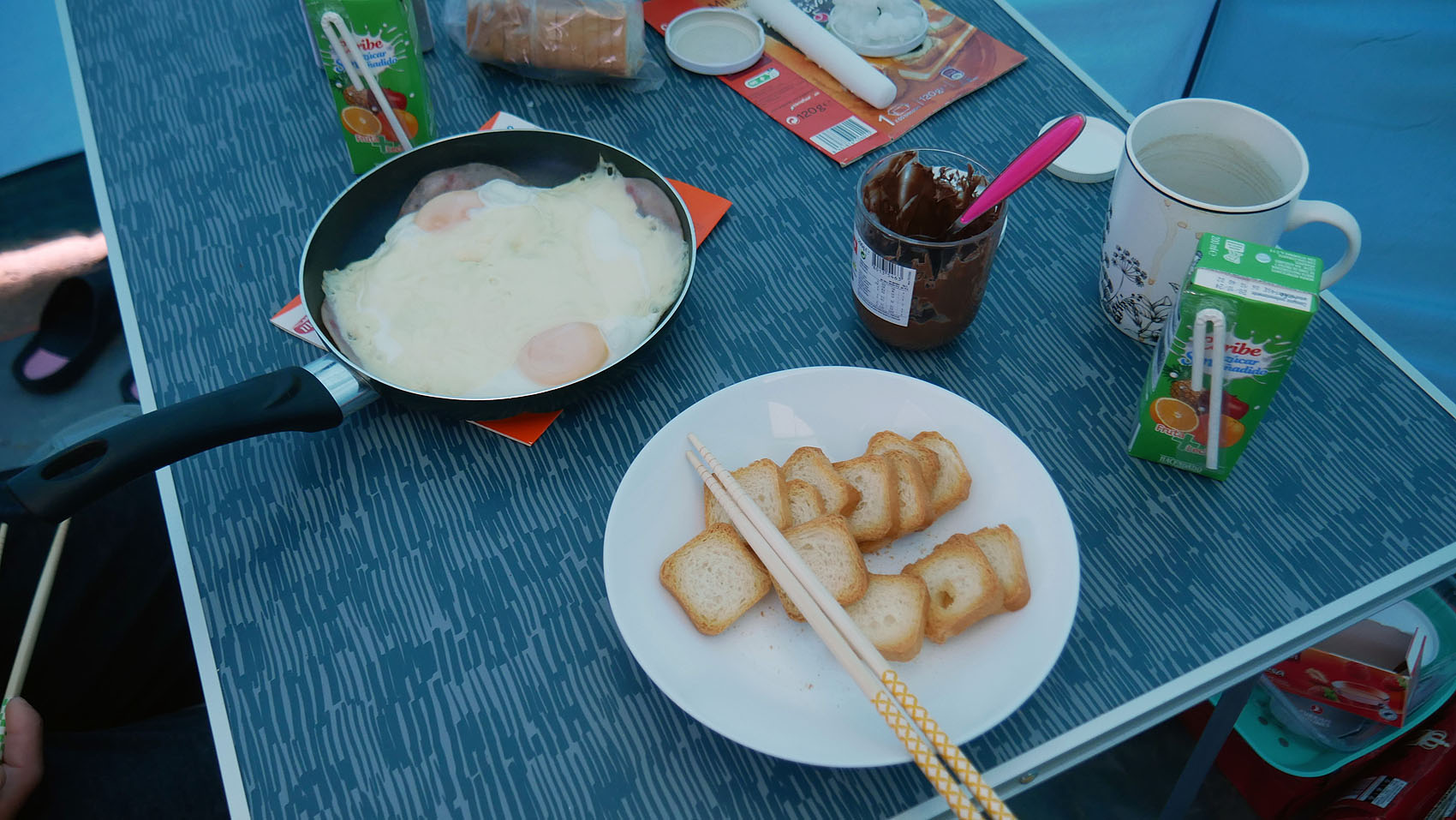 9時半頃、朝ごはん。前室の気温16度、湿度62%、涼しい。