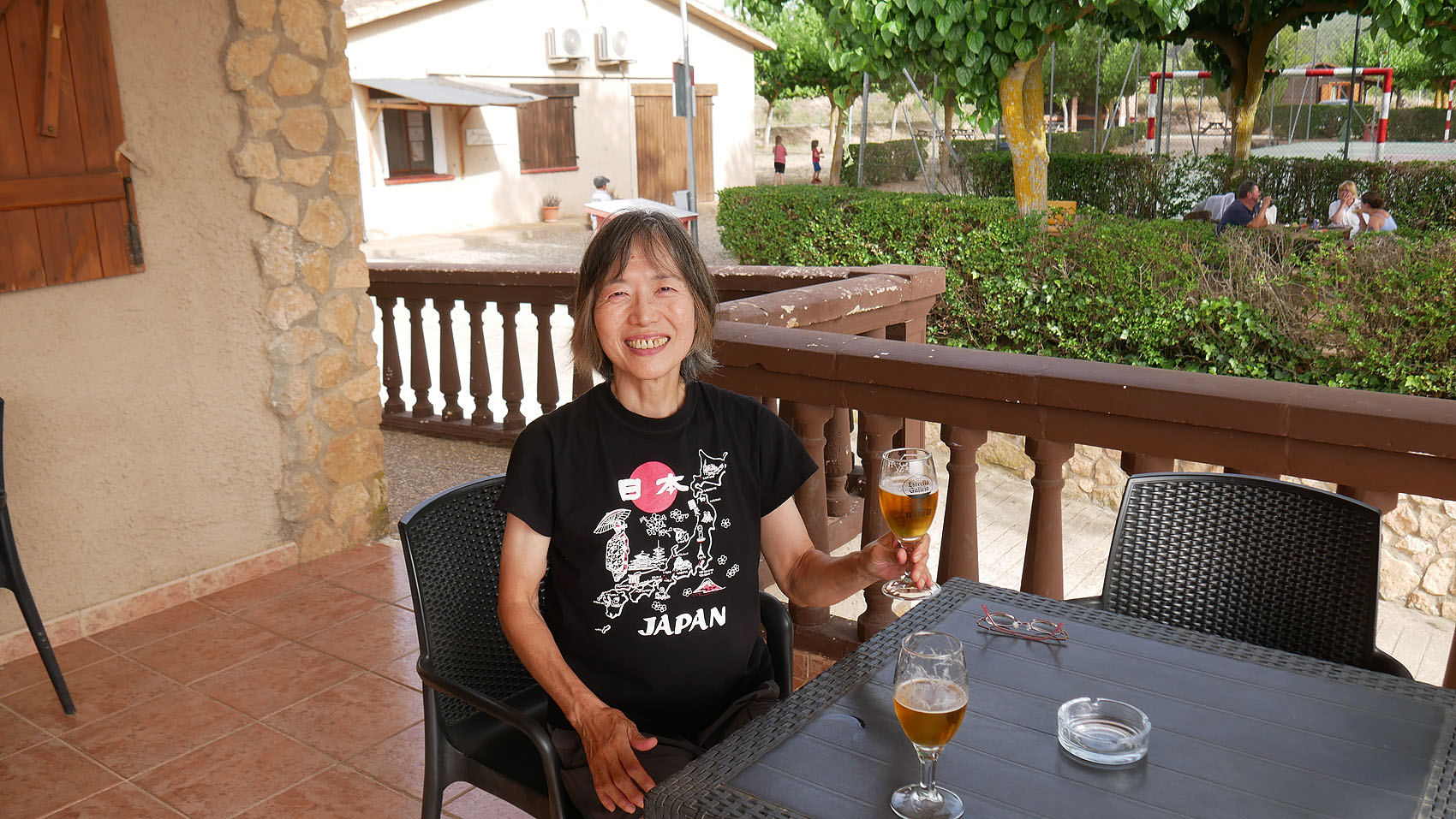 黄砂で霞んでいるのが残念だけど、テラスからの景色も素晴らしく、テント場からは見えない、崖の前傾壁を眺めたりして、生ビールをもう一杯。
