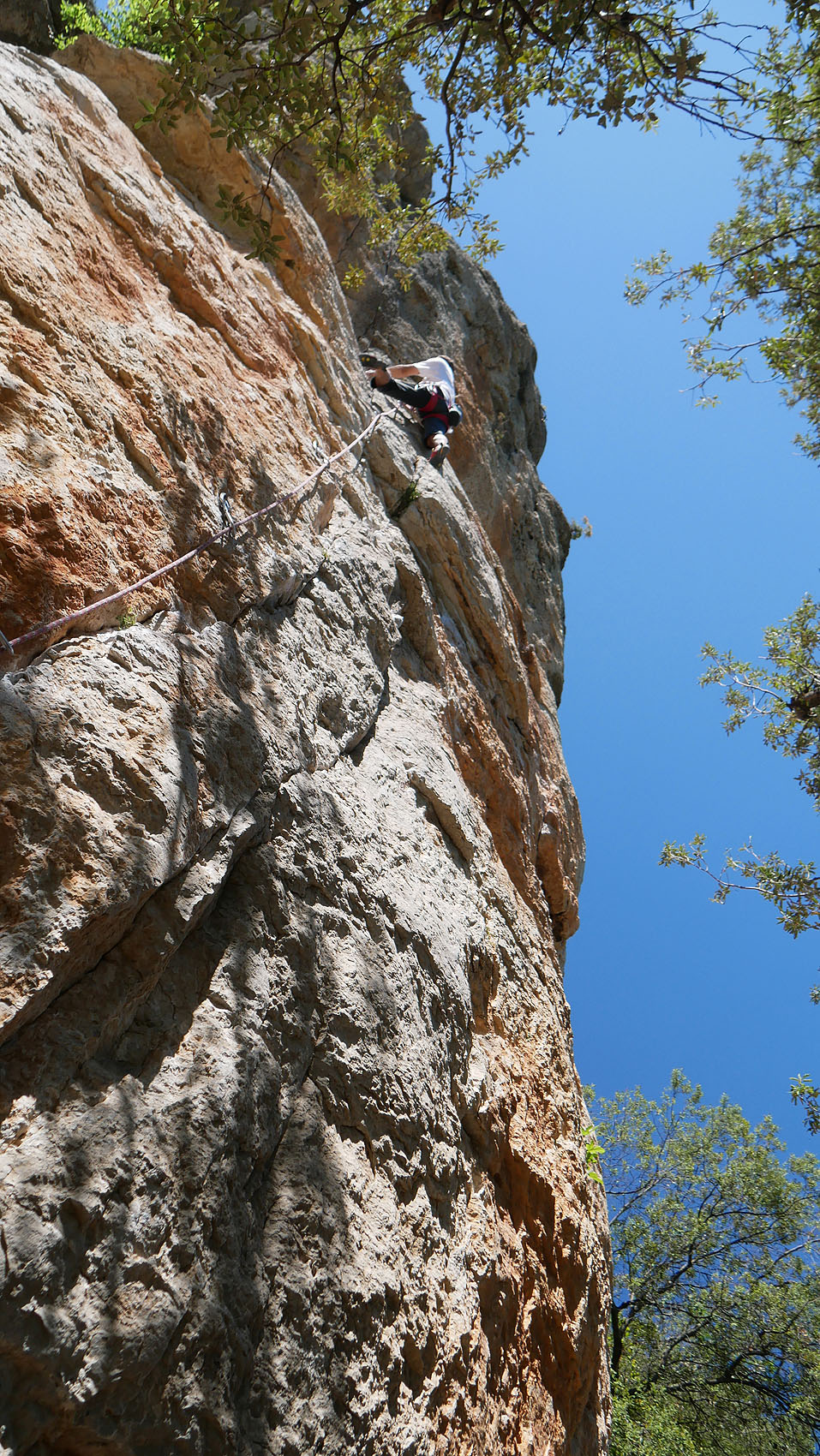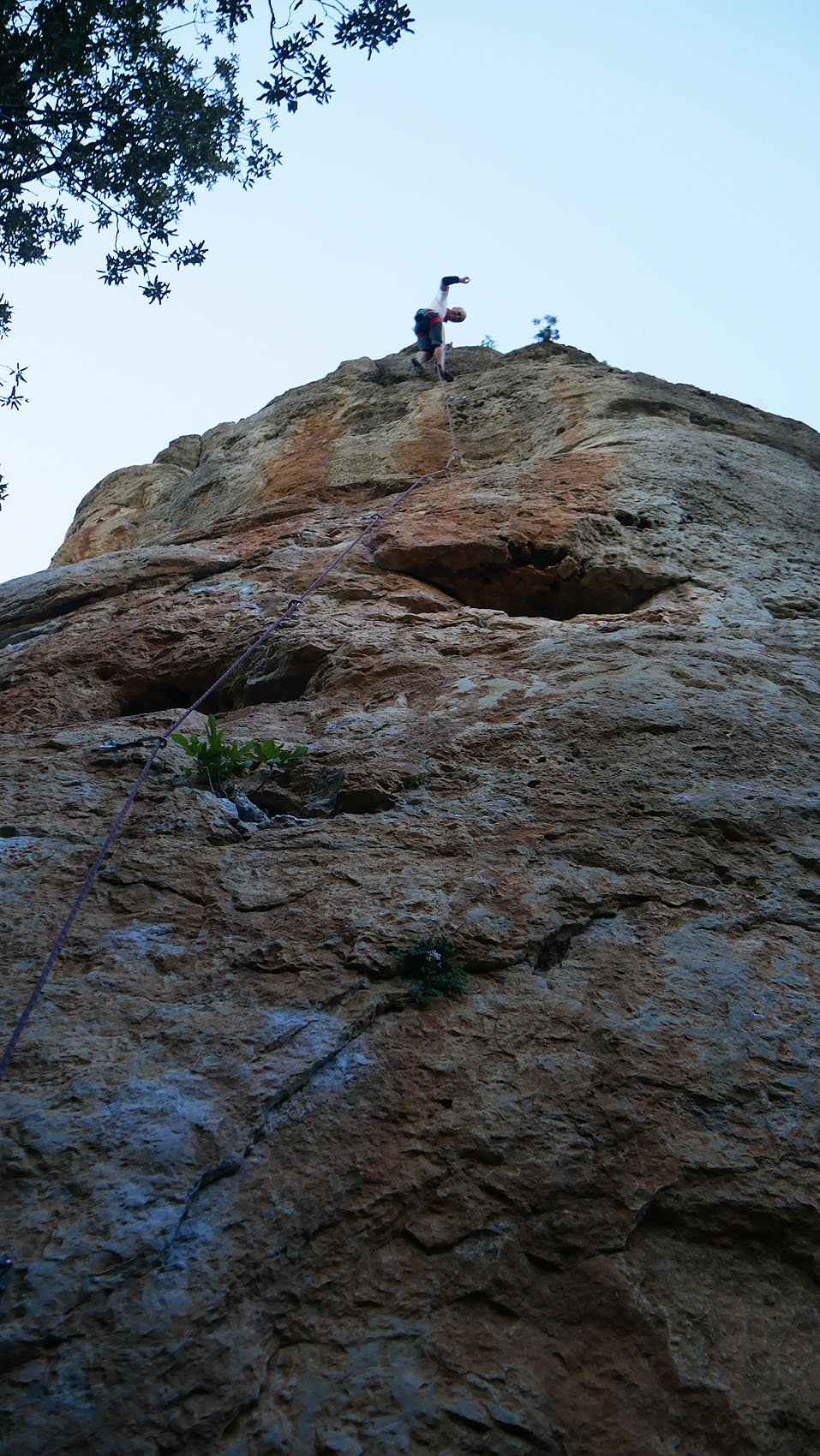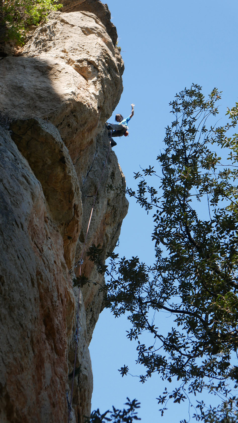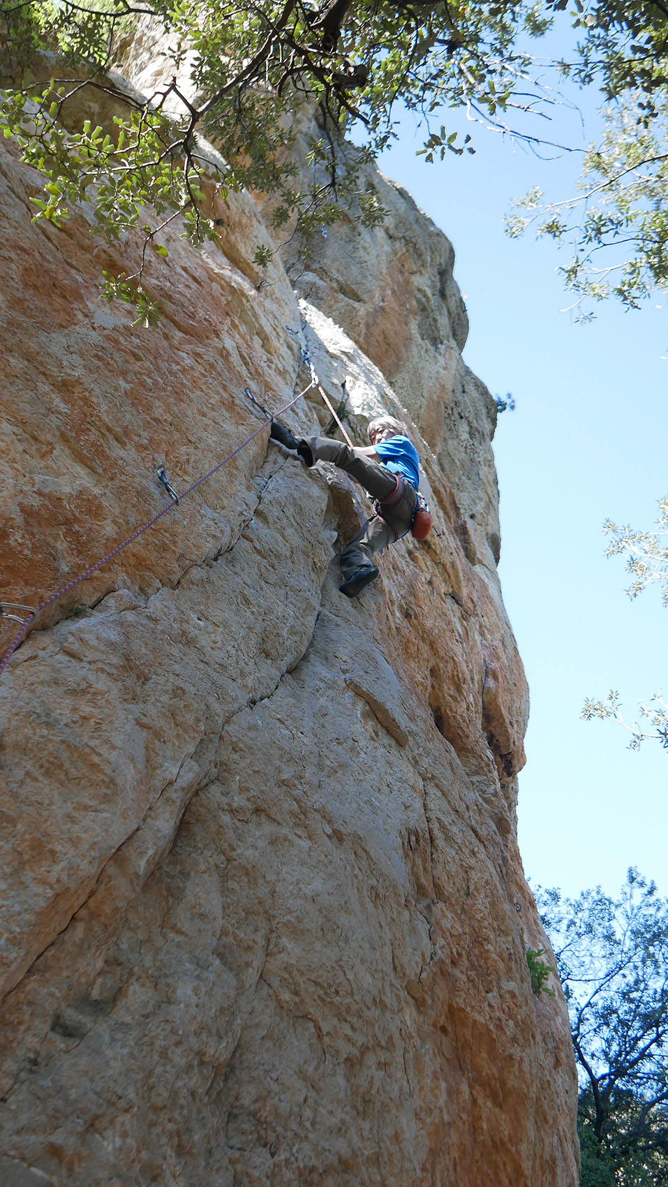 ダンナが、Agulletes a les tetes 7a を登る準備をしているときに、陽気なローカルクライマーが4人、右上から降りて来た。