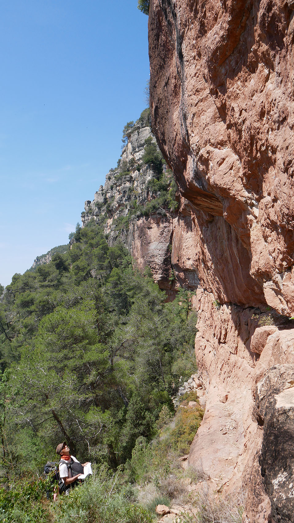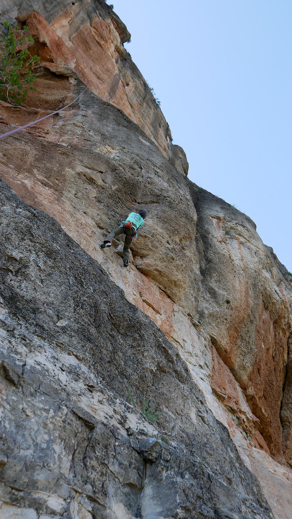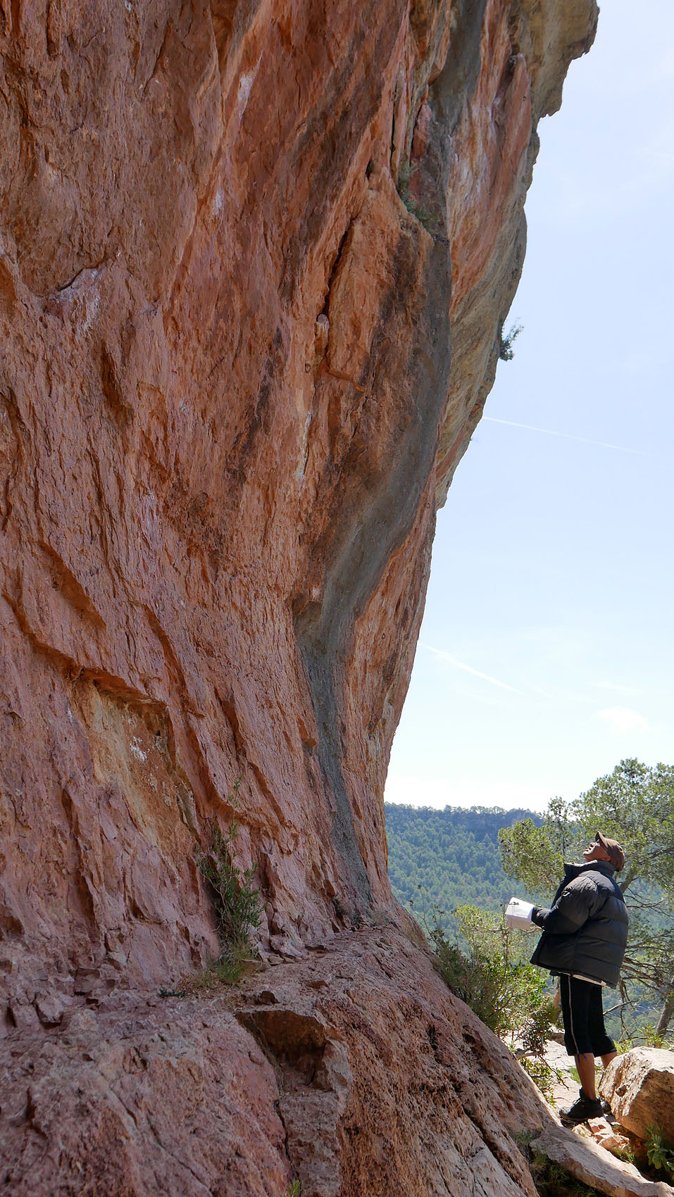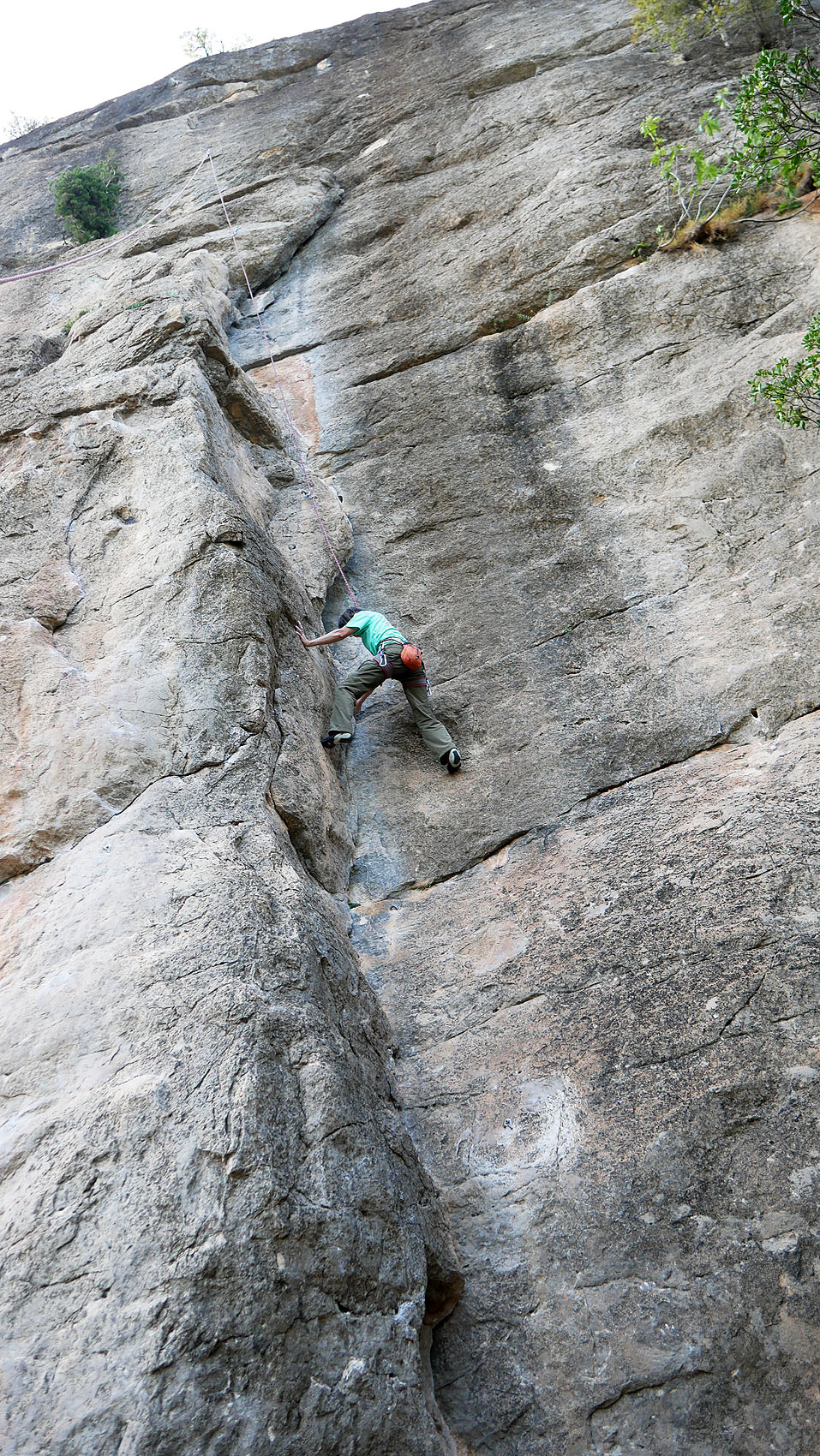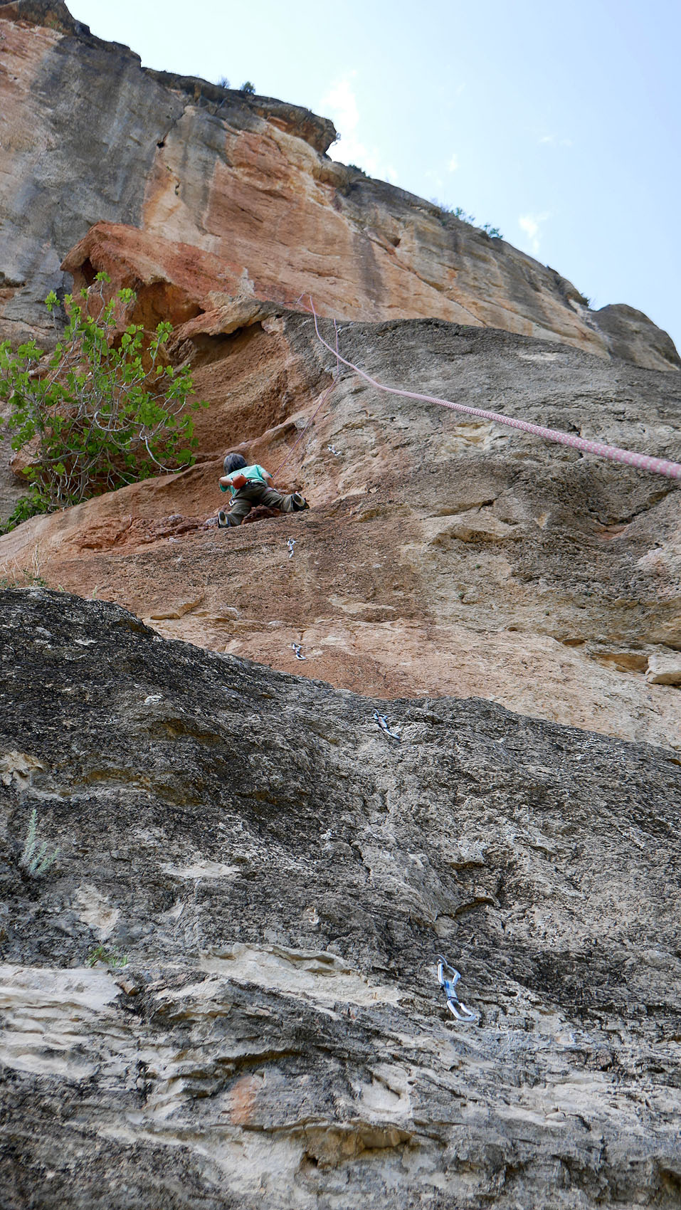 ダンナが、Agulletes a les tetes 7a を登る準備をしているときに、陽気なローカルクライマーが4人、右上から降りて来た。