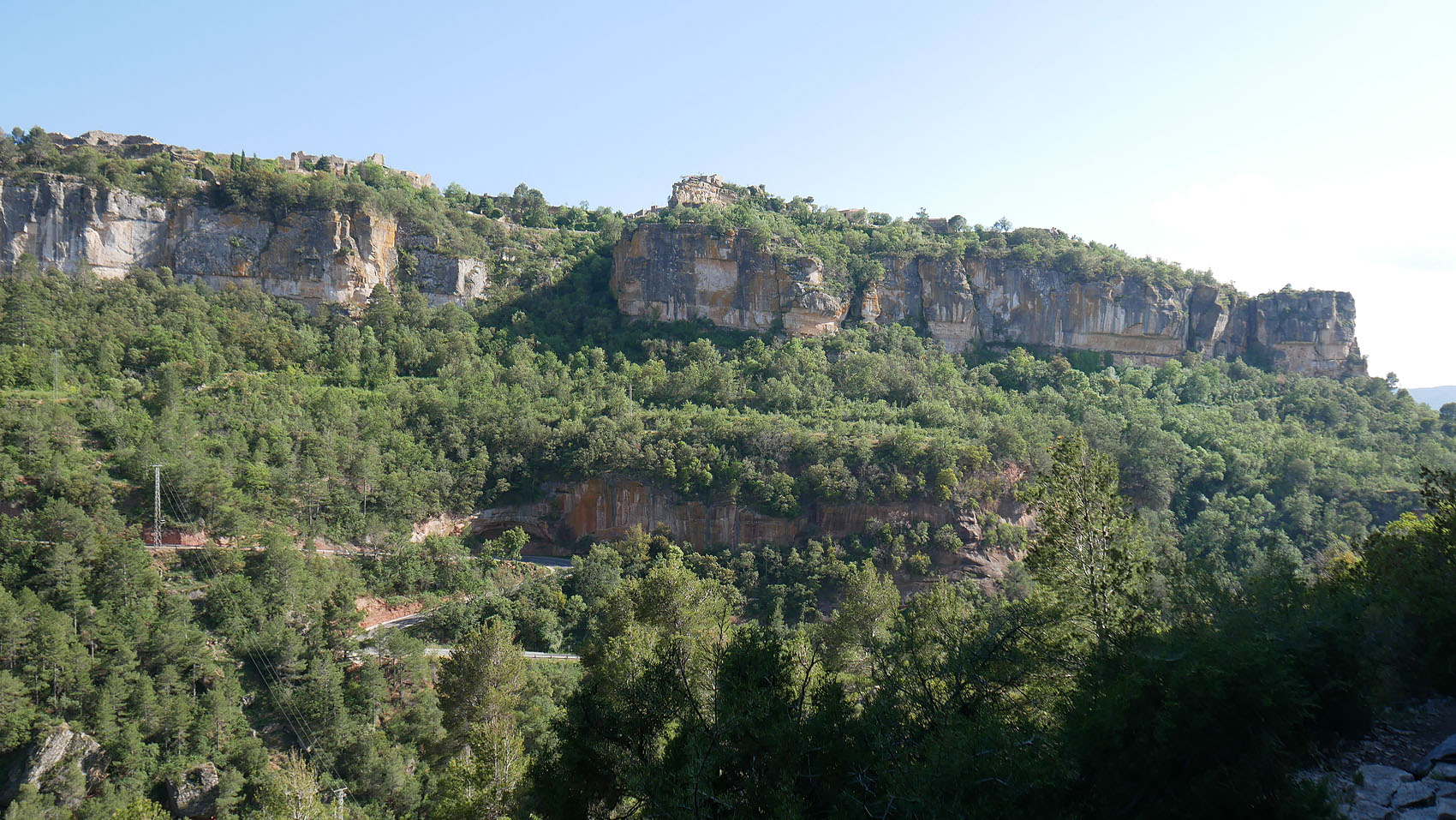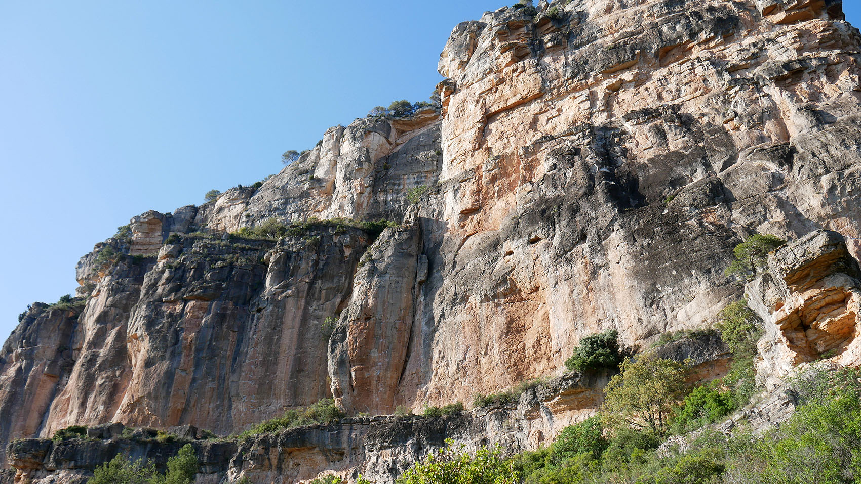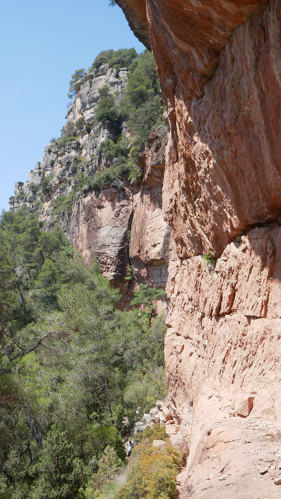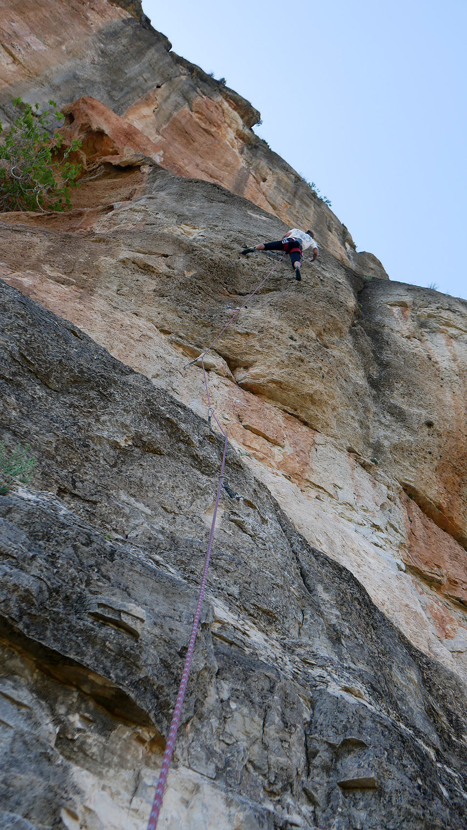 ダンナが、Agulletes a les tetes 7a を登る準備をしているときに、陽気なローカルクライマーが4人、右上から降りて来た。